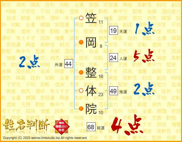笠(11画)岡(8画) 整(16画)体(23画)院(10画)