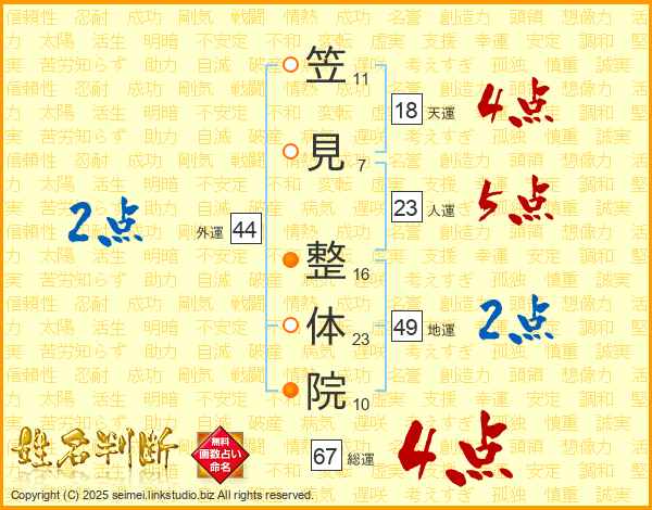 笠(11画)見(7画) 整(16画)体(23画)院(10画)