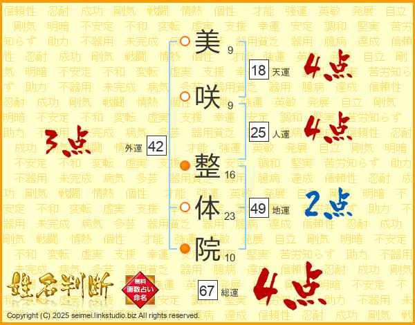 美(9画)咲(9画) 整(16画)体(23画)院(10画)