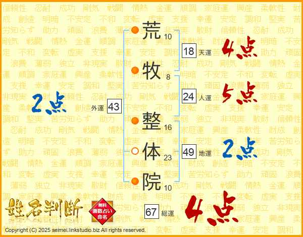 生活面を象徴する運勢です。外部から受ける影響力を表し、結婚運、家庭運や職場、環境への順応性を表します。総運から人運を引いた画数。姓や名が1文字の場合を除く。