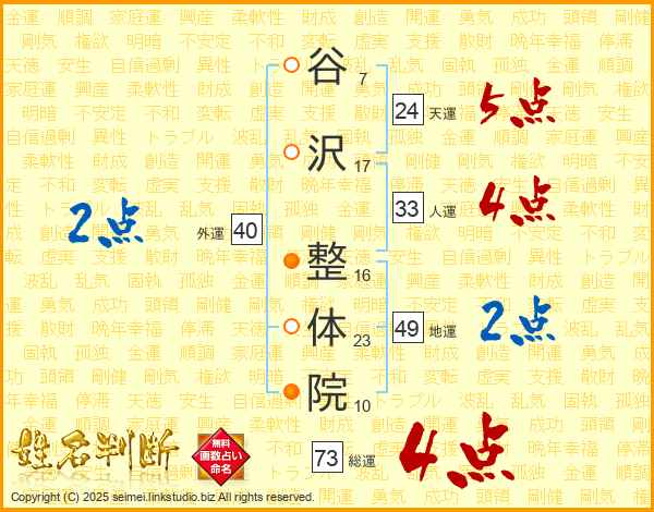 谷(7画)沢(17画) 整(16画)体(23画)院(10画)