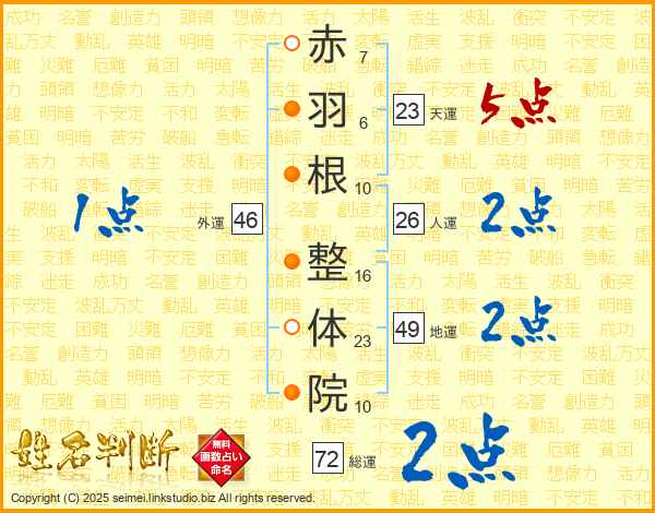 赤(7画)羽(6画)根(10画) 整(16画)体(23画)院(10画)