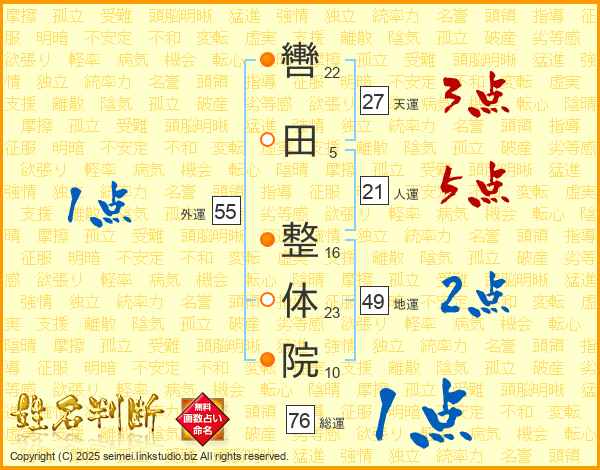 生活面を象徴する運勢です。外部から受ける影響力を表し、結婚運、家庭運や職場、環境への順応性を表します。総運から人運を引いた画数。姓や名が1文字の場合を除く。
