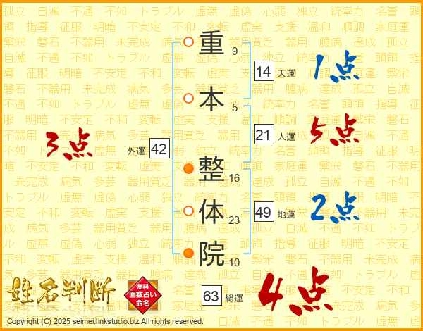 重(9画)本(5画) 整(16画)体(23画)院(10画)