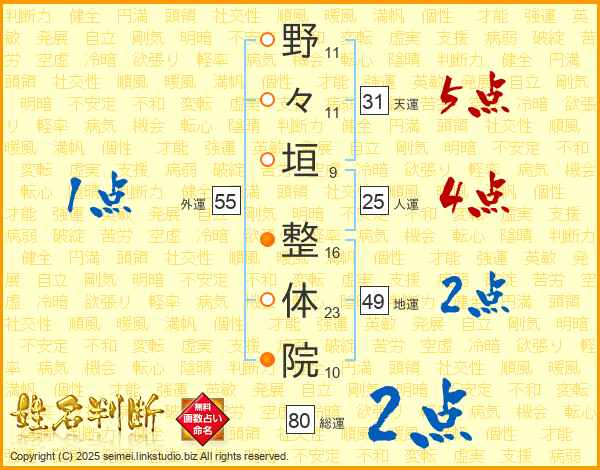 生活面を象徴する運勢です。外部から受ける影響力を表し、結婚運、家庭運や職場、環境への順応性を表します。総運から人運を引いた画数。姓や名が1文字の場合を除く。