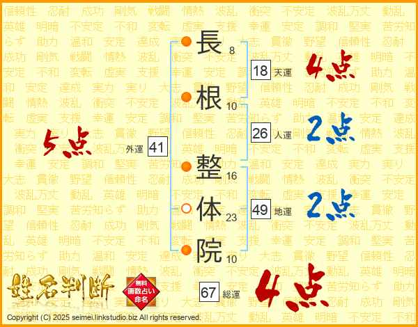 あなたの人生を表す1番重要な運勢です。生涯を通じて影響する総合運となり、主に50歳以降の晩年期に影響を及ぼします。苗字と名前の合計画数。