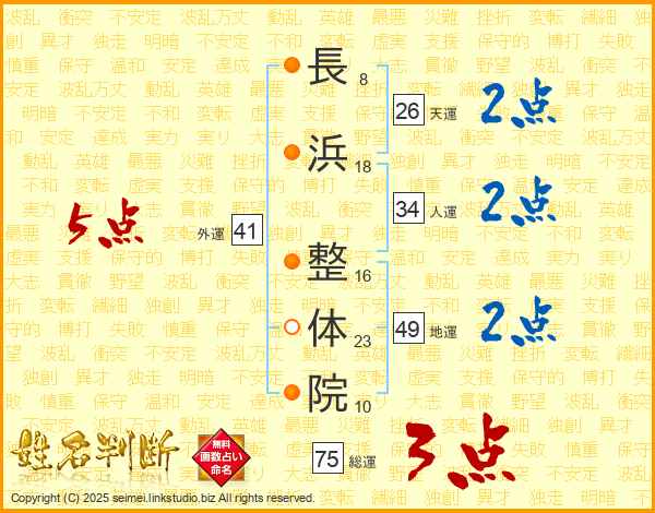 長(8画)浜(18画) 整(16画)体(23画)院(10画)