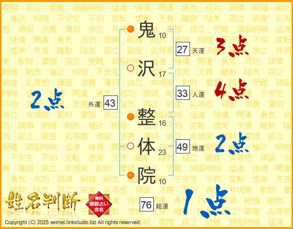 鬼(10画)沢(17画) 整(16画)体(23画)院(10画)