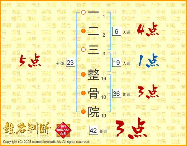 生活面を象徴する運勢です。外部から受ける影響力を表し、結婚運、家庭運や職場、環境への順応性を表します。総運から人運を引いた画数。姓や名が1文字の場合を除く。