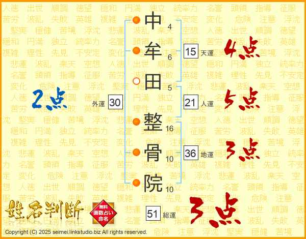 中(4画)牟(6画)田(5画) 整(16画)骨(10画)院(10画)