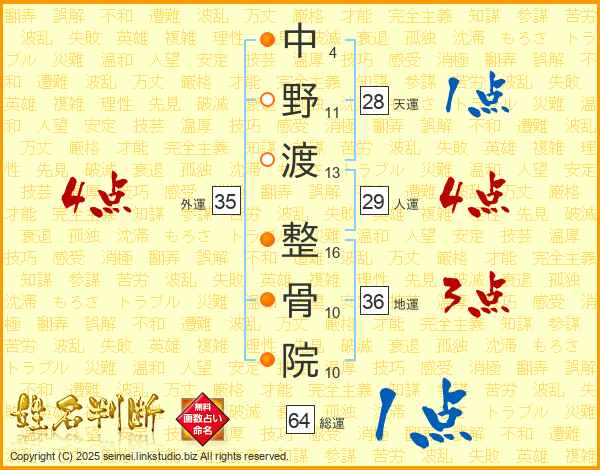 中(4画)野(11画)渡(13画) 整(16画)骨(10画)院(10画)