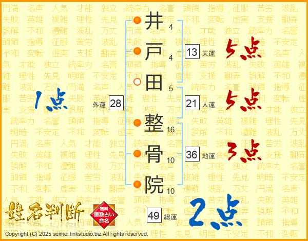 井(4画)戸(4画)田(5画) 整(16画)骨(10画)院(10画)