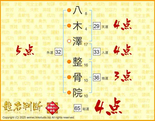 八(8画)木(4画)澤(17画) 整(16画)骨(10画)院(10画)