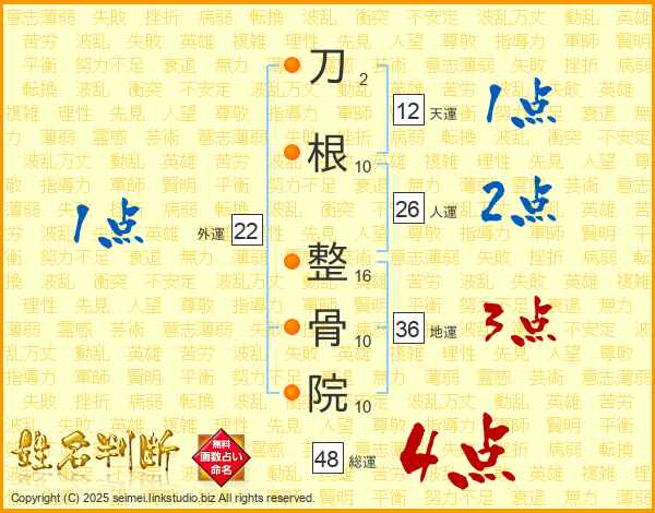 あなたの人生を表す1番重要な運勢です。生涯を通じて影響する総合運となり、主に50歳以降の晩年期に影響を及ぼします。苗字と名前の合計画数。