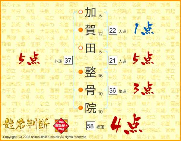 加(5画)賀(12画)田(5画) 整(16画)骨(10画)院(10画)