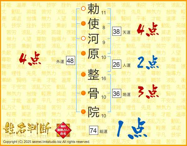 勅(11画)使(8画)河(9画)原(10画) 整(16画)骨(10画)院(10画)