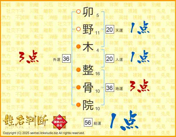 生活面を象徴する運勢です。外部から受ける影響力を表し、結婚運、家庭運や職場、環境への順応性を表します。総運から人運を引いた画数。姓や名が1文字の場合を除く。