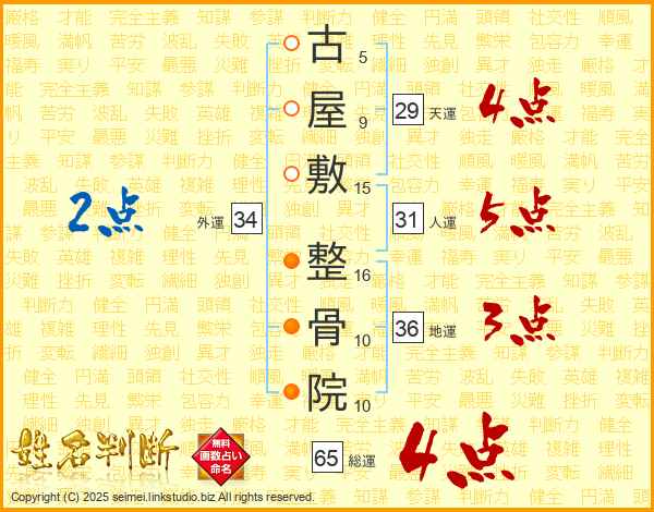 古(5画)屋(9画)敷(15画) 整(16画)骨(10画)院(10画)