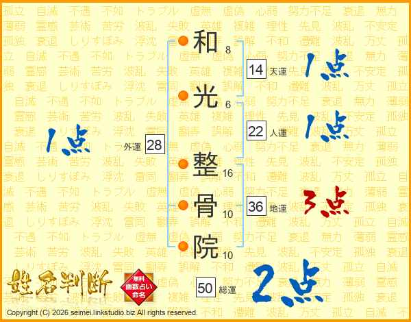 生活面を象徴する運勢です。外部から受ける影響力を表し、結婚運、家庭運や職場、環境への順応性を表します。総運から人運を引いた画数。姓や名が1文字の場合を除く。