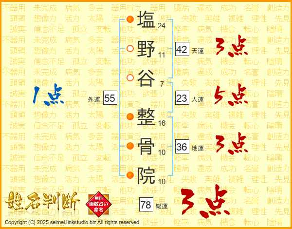 塩(24画)野(11画)谷(7画) 整(16画)骨(10画)院(10画)