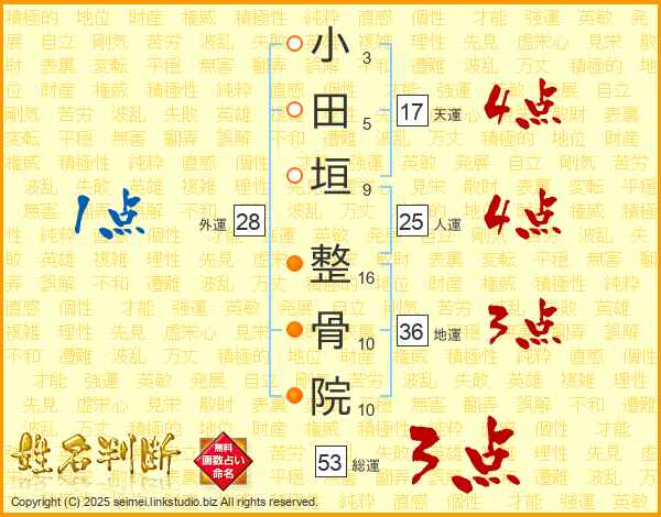 小(3画)田(5画)垣(9画) 整(16画)骨(10画)院(10画)