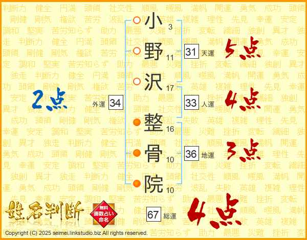 小(3画)野(11画)沢(17画) 整(16画)骨(10画)院(10画)