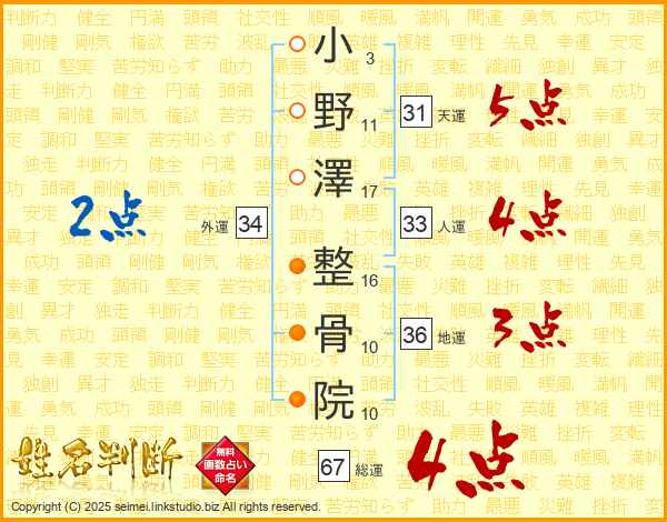 小(3画)野(11画)澤(17画) 整(16画)骨(10画)院(10画)