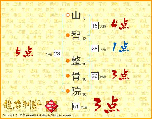 山(3画)智(12画) 整(16画)骨(10画)院(10画)