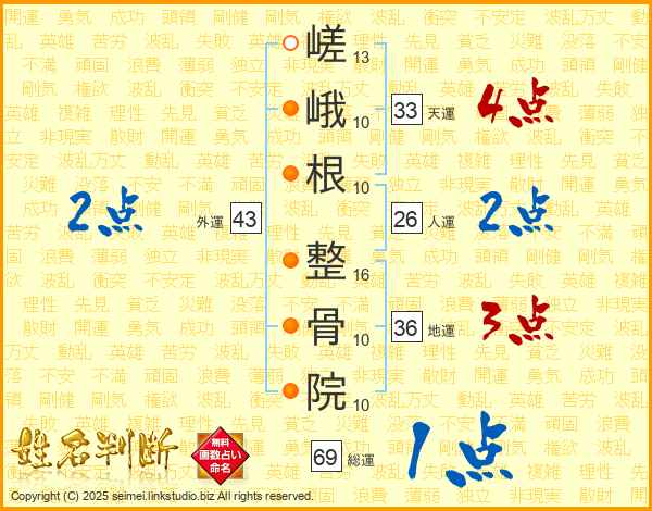 嵯(13画)峨(10画)根(10画) 整(16画)骨(10画)院(10画)
