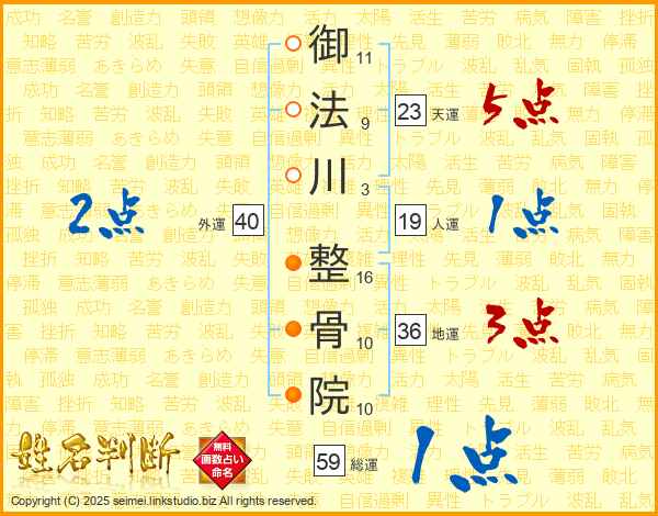 御(11画)法(9画)川(3画) 整(16画)骨(10画)院(10画)
