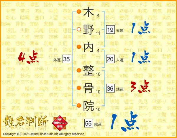 木(4画)野(11画)内(4画) 整(16画)骨(10画)院(10画)