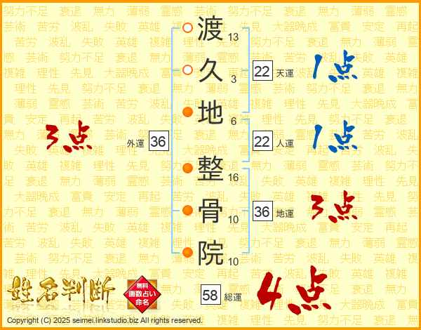 渡(13画)久(3画)地(6画) 整(16画)骨(10画)院(10画)