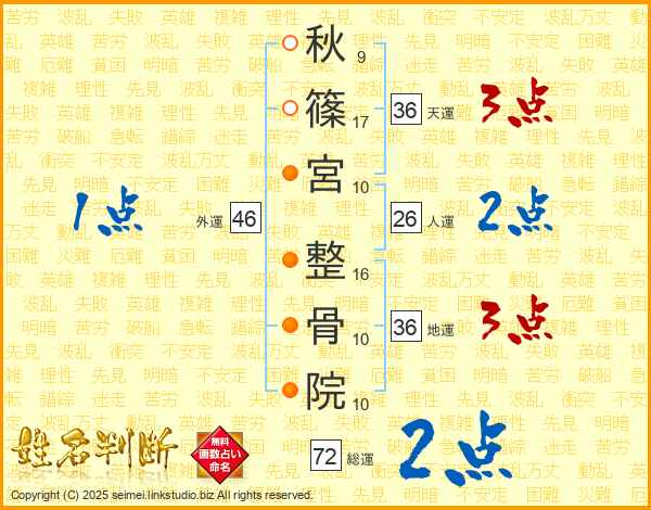 秋(9画)篠(17画)宮(10画) 整(16画)骨(10画)院(10画)