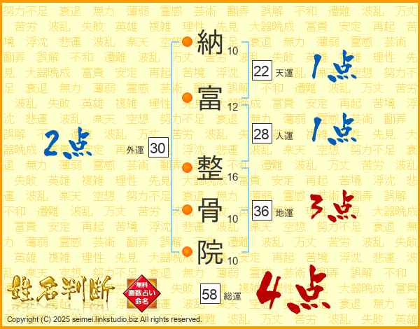 納(10画)富(12画) 整(16画)骨(10画)院(10画)