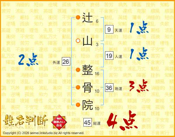 辻(6画)山(3画) 整(16画)骨(10画)院(10画)