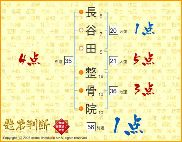 長(8画)谷(7画)田(5画) 整(16画)骨(10画)院(10画)