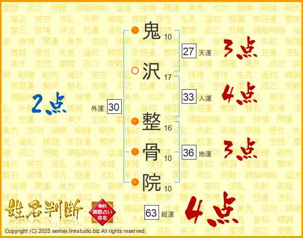 鬼(10画)沢(17画) 整(16画)骨(10画)院(10画)