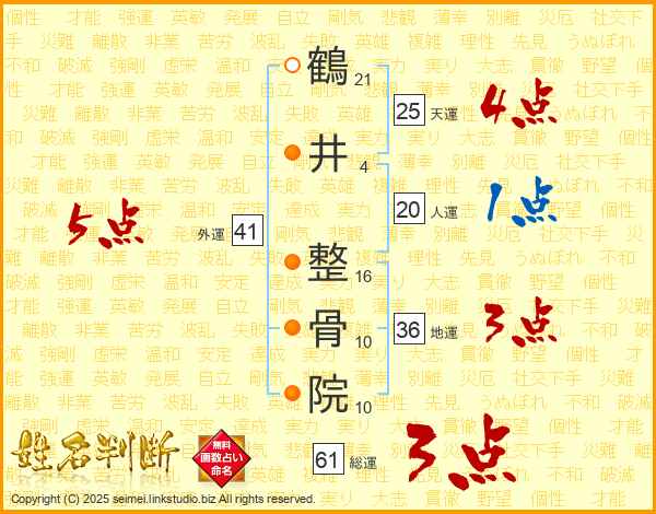 鶴(21画)井(4画) 整(16画)骨(10画)院(10画)