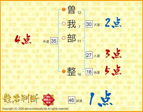生活面を象徴する運勢です。外部から受ける影響力を表し、結婚運、家庭運や職場、環境への順応性を表します。総運から人運を引いた画数。姓や名が1文字の場合を除く。