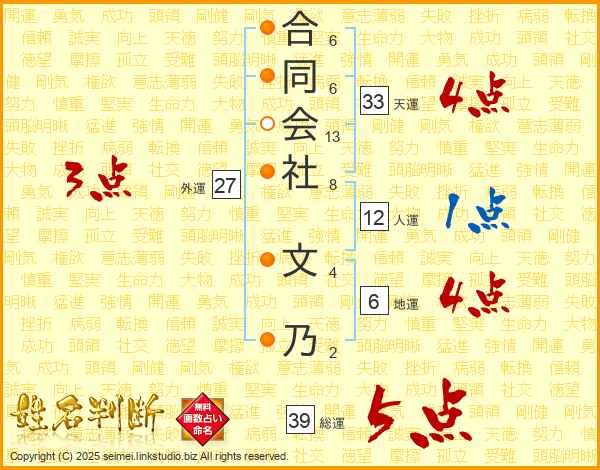 合同会社文乃さんの総運は39画の5点!