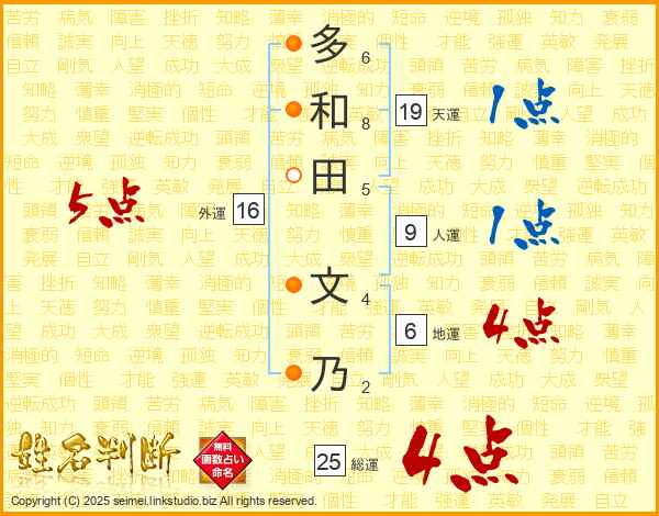生活面を象徴する運勢です。外部から受ける影響力を表し、結婚運、家庭運や職場、環境への順応性を表します。総運から人運を引いた画数。姓や名が1文字の場合を除く。