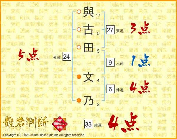 與(17画)古(5画)田(5画) 文(4画)乃(2画)