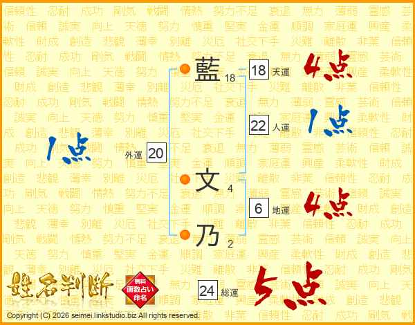 あなたの人生を表す1番重要な運勢です。生涯を通じて影響する総合運となり、主に50歳以降の晩年期に影響を及ぼします。苗字と名前の合計画数。