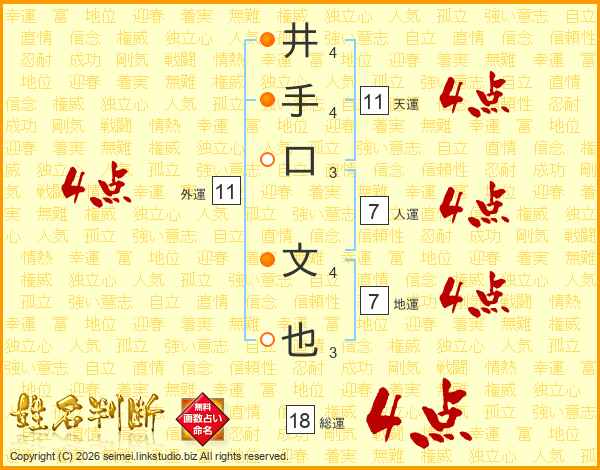 井(4画)手(4画)口(3画) 文(4画)也(3画)