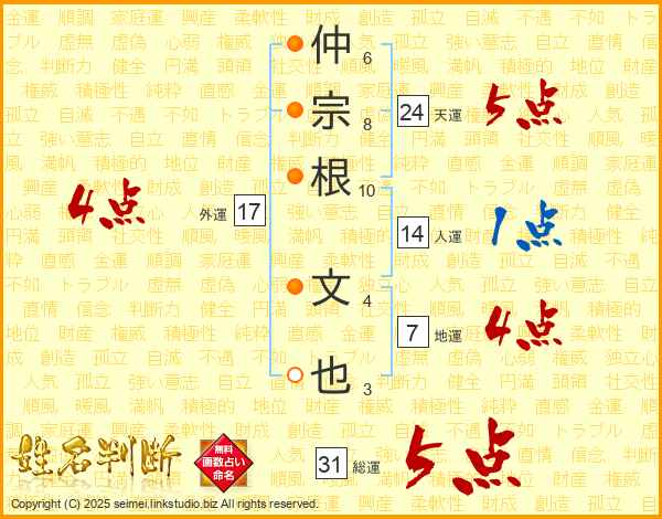 仲(6画)宗(8画)根(10画) 文(4画)也(3画)