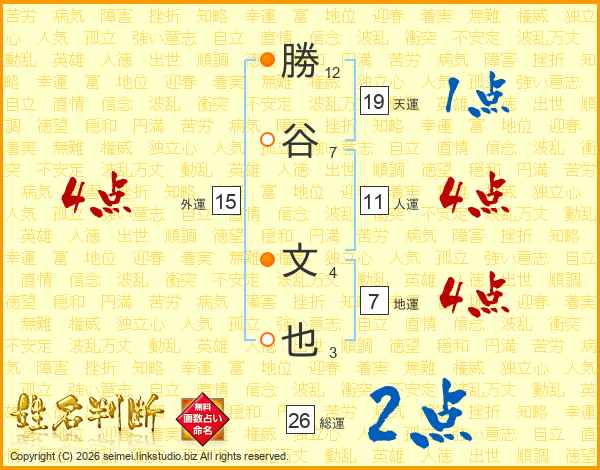 生活面を象徴する運勢です。外部から受ける影響力を表し、結婚運、家庭運や職場、環境への順応性を表します。総運から人運を引いた画数。姓や名が1文字の場合を除く。
