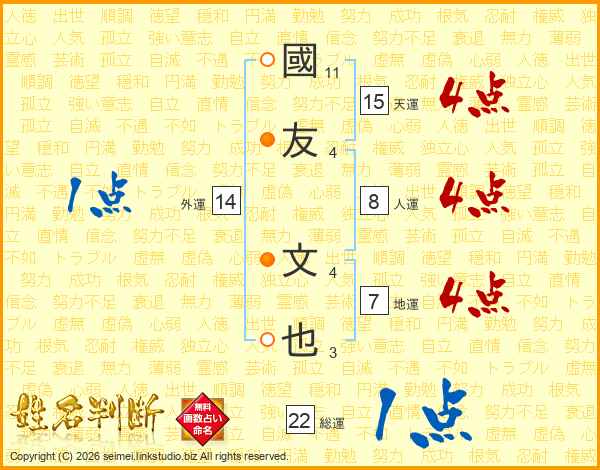 生活面を象徴する運勢です。外部から受ける影響力を表し、結婚運、家庭運や職場、環境への順応性を表します。総運から人運を引いた画数。姓や名が1文字の場合を除く。