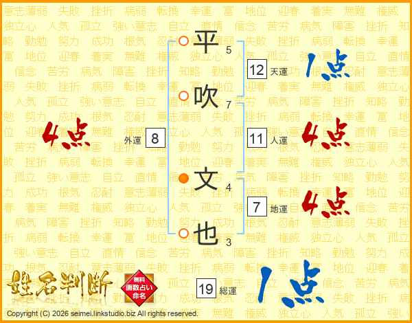 生活面を象徴する運勢です。外部から受ける影響力を表し、結婚運、家庭運や職場、環境への順応性を表します。総運から人運を引いた画数。姓や名が1文字の場合を除く。