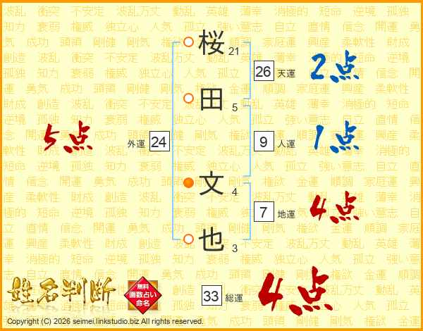 桜田文也さんの天運は26画の2点!