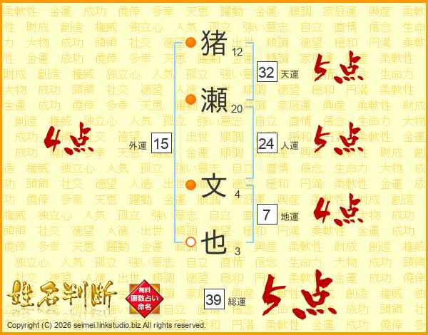 猪瀬文也さんの総運は39画の5点!